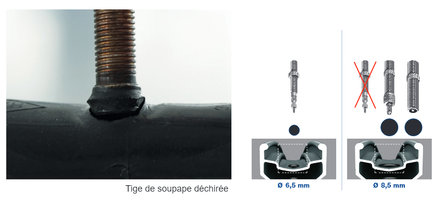 Attention : si vous utilisez des chambres à air avec des valves Sclaverand dans des jantes avec des trous de valve plus grands, vous risquez de casser la valve, car le bord métallique du trou peut alors séparer la tige de valve de la chambre à air.