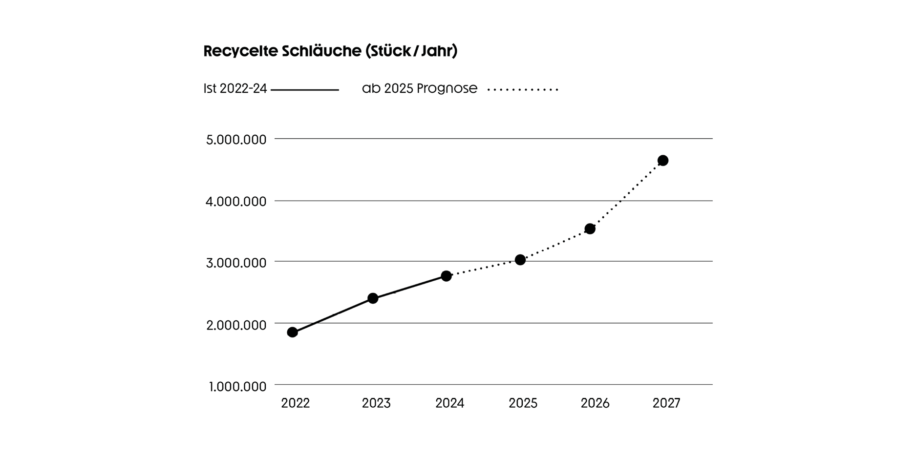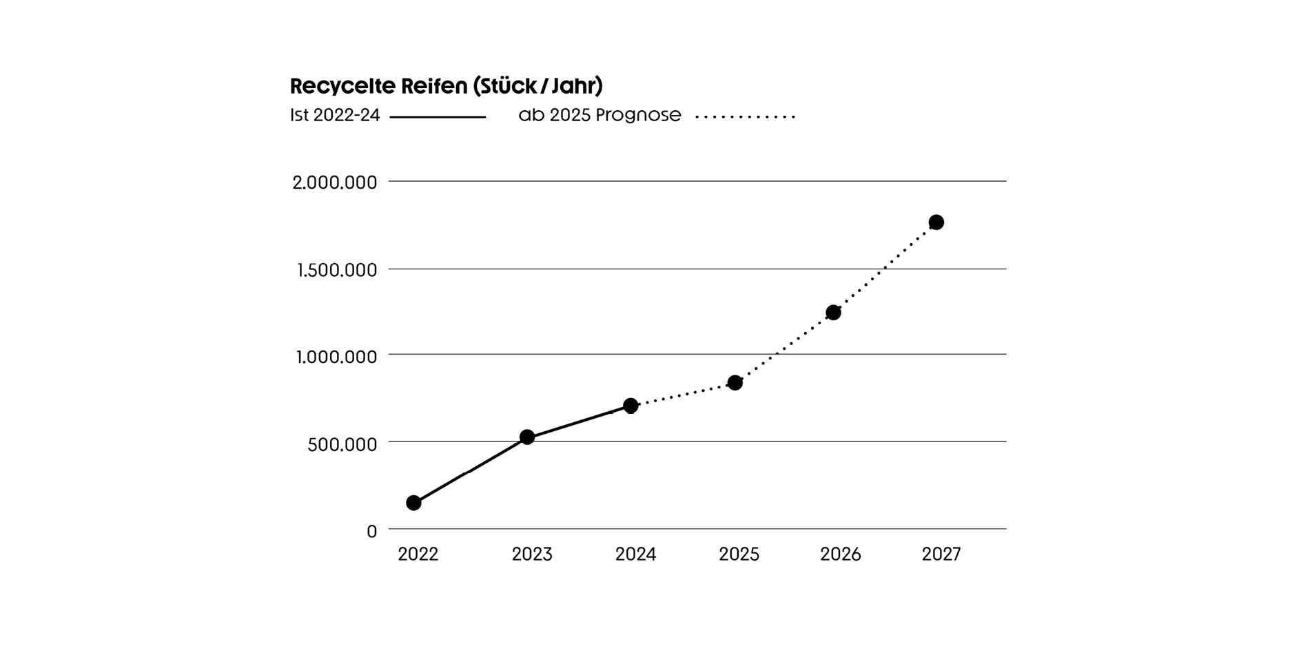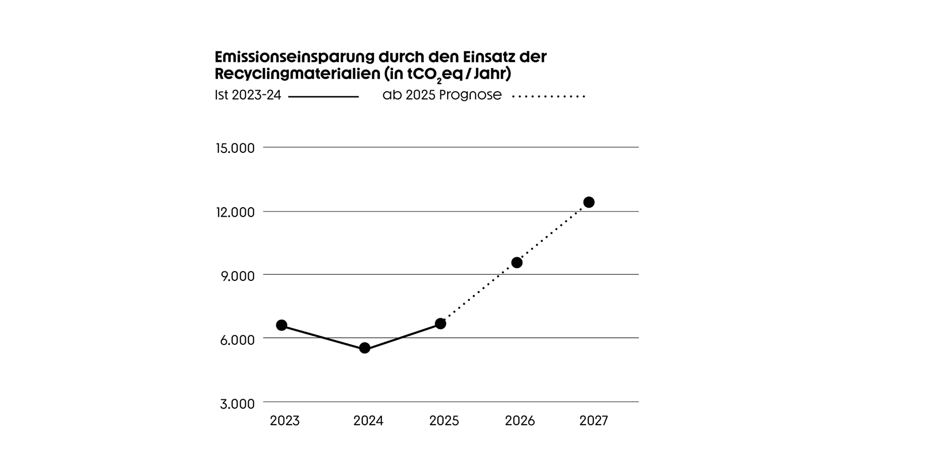 Transparenz gehört zu unserem Anspruch. Unsere Recycling-Grafik macht sichtbar, was sonst unsichtbar bleibt: aktuelle Rücklaufmengen, Recyclingquoten und die jährlich eingesparte CO₂-Menge. Diese Daten sind mehr als Statistik und sie bilden die Basis für Prognosen, die zeigen, wie wir Recyclingvolumen und Materialkreisläufe weiter ausbauen.