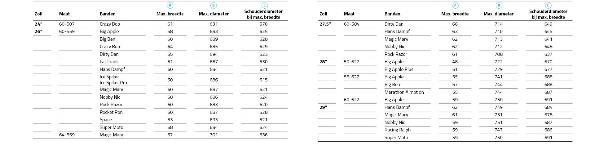 Let op: Neem altijd de informatie over maximale luchtdruk en bandtype (tubeless/buis-type) van de velgfabrikant in acht.