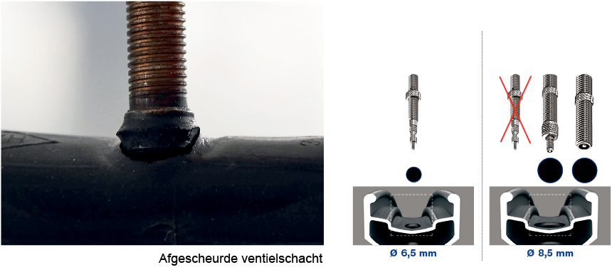 Let op: Als je binnenbanden met een sclaverand ventiel gebruikt in velgen met grotere ventielgaten, kan het ventiel afscheuren, omdat de metalen rand van het ventielgat dan de ventielschacht van de binnenband kan afscheuren.